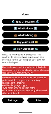 Den intuitive og rene utformingen av "Spas of Budapest" sikrer at du raskt finner frem til den informasjonen som betyr noe for deg, uten unødvendige distraksjoner. Enten du søker total avslapning, en dypt historisk opplevelse, eller noe unikt for Budapest, veileder appen deg til det perfekte valget. Se frem til spennende utvidelser der også mindre kjente, lokale favoritter vil bli inkludert. Og for å gjøre opplevelsen enda mer tilgjengelig, er oversettelser til språk som japansk, spansk, fransk og tysk allerede underveis. Med "Spas of Budapest" er du sikret en autentisk og uforglemmelig badeopplevelse, rett fra en lokal ekspert.