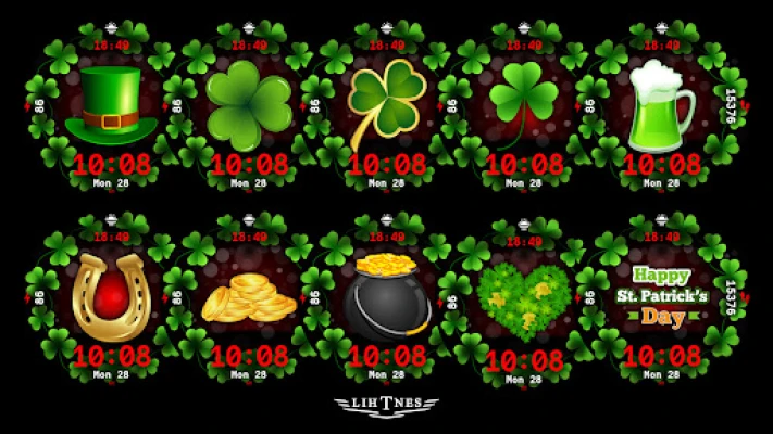 Feire St. Patrick's Day med uovertruffen stil og grønn glede direkte fra håndleddet! St. Patrick's Day watch face er din ultimate følgesvenn for å omfavne festlighetene. Dette klokkeansiktet er skreddersydd for anledningen og forvandler din Wear OS-enhet til et levende symbol på irsk kultur, komplett med klassiske shamrocks og en gjennomgående grønn estetikk. Gjør deg klar til å uttrykke din festånd med et design som fanger essensen av denne spesielle dagen.