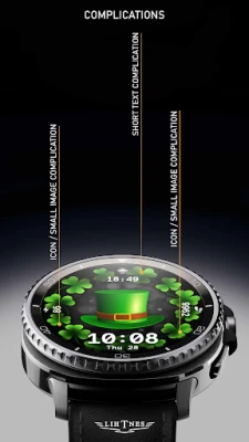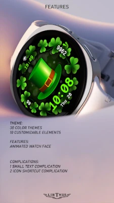 Opplev enestående tilpasningsmuligheter som lar deg sette ditt personlige preg. Velg mellom 10 unike, feststemte elementer, fra sjarmerende hatter til ikoniske trebladede kløvere, for å skape et uttrykk som er helt ditt eget. Med hele 14 fargetemaer kan du justere klokkeansiktet til å matche ditt antrekk eller humør perfekt. Dynamiske animasjoner, inkludert livlige shamrocks og en bakgrunn som vekkes til live, legger til en ekstra dimensjon av sjarm. For praktisk informasjon har du tilgang til essensielle data som tid (12/24-timers format), dato, ukedag, batterinivå og skritteller, supplert med tre snarveiskomplikasjoner for ikoner/bilder og en kort tekstkomplikasjon for rask tilgang til det viktigste. Den optimaliserte AOD-modusen sørger for at skjermen ser fantastisk ut, dag som natt.